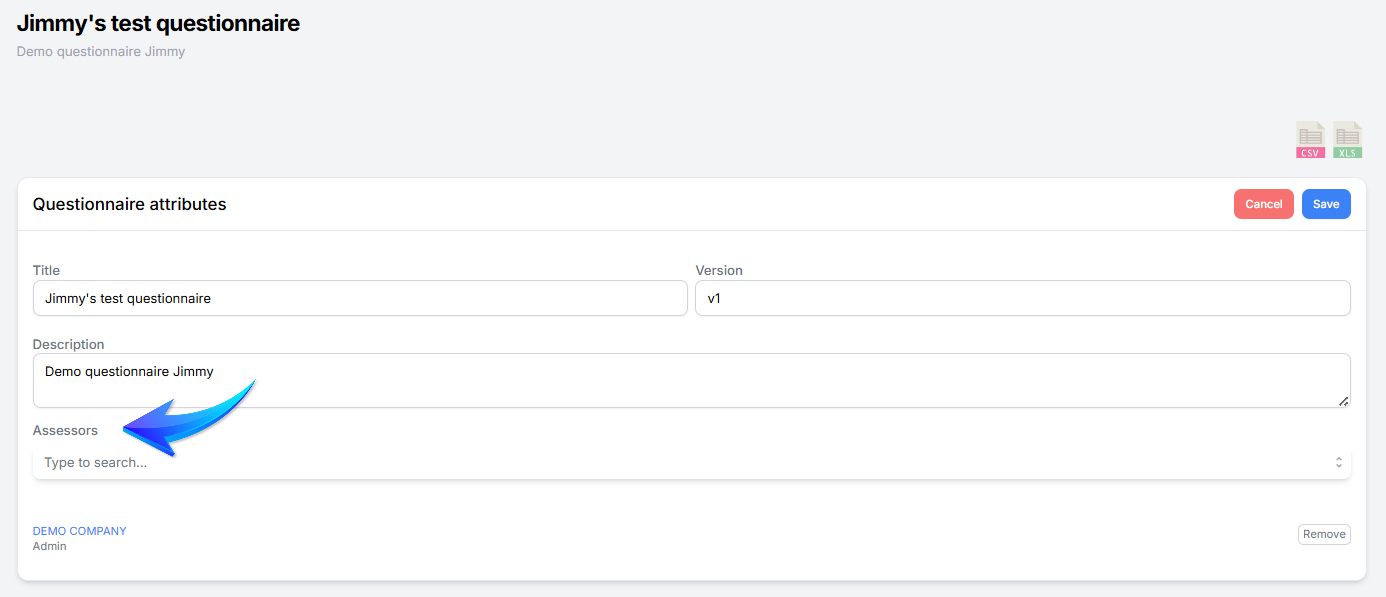 - Questionnaire assessors. These Ceeyu users are informed of changes in the status of all assessments using the questionnaire for which they are configured as assessors, regardless of which suppliers the assessments are sent to. Unlike users (suppliers) and contacts, assessors must be configured from the Questionnaire Library page.