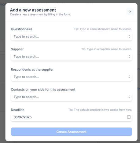 - Supplier respondents: select the respondents to whom you wish to send the assessment. Multiple respondents can be selected. Supplier contacts must first be added from the supplier page before being visible in the drop-down list.