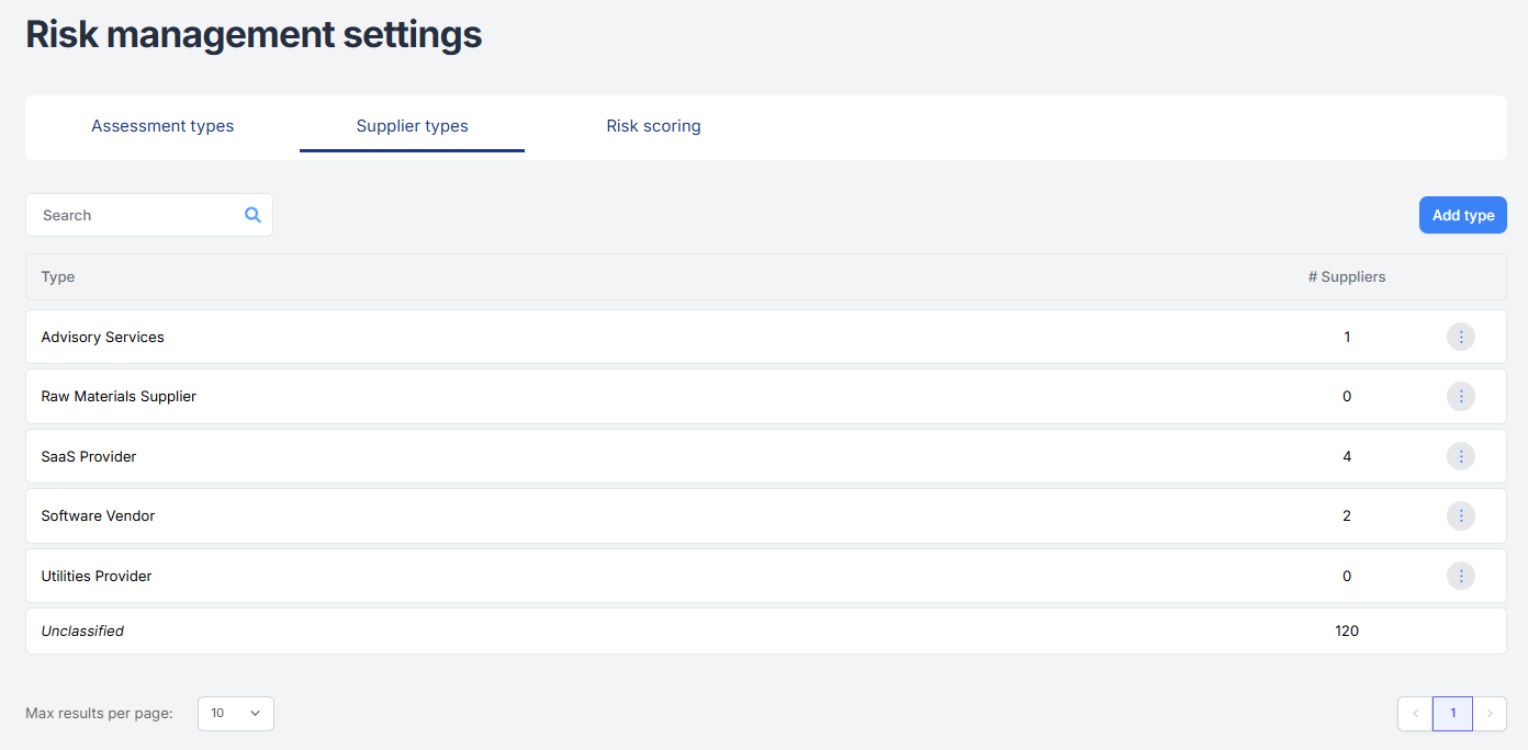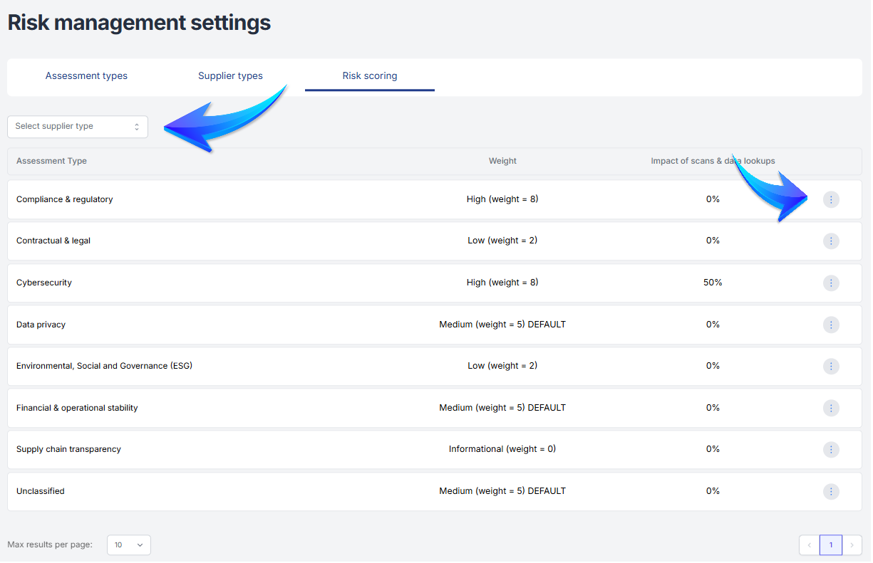 To begin, select the supplier type for which you wish to configure the risk rating. Then configure the impact of an assessment type using the three-point menu.
