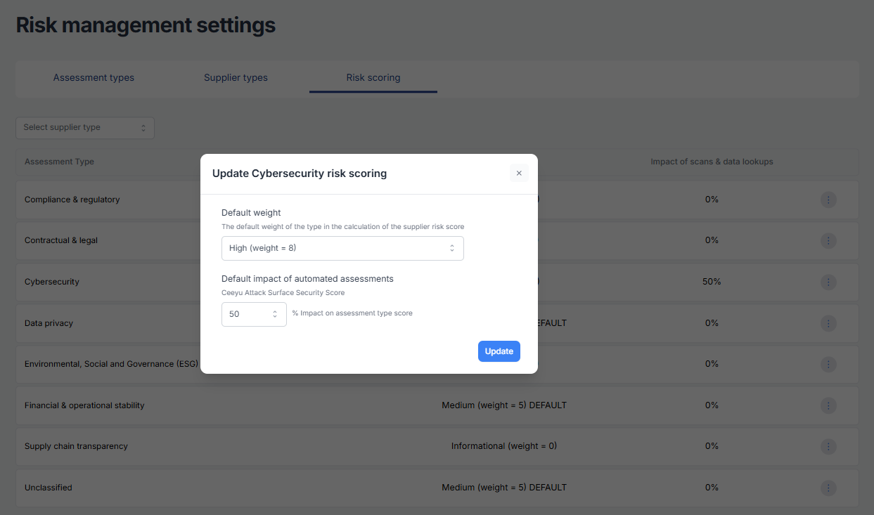 The supplier's overall risk rating may depend on the Assessment Type and Supplier Type. For example, the impact of cybersecurity assessments will be higher for a mission-critical SaaS provider than for an office supplies vendor. This can be done from the Risk scoring tab.